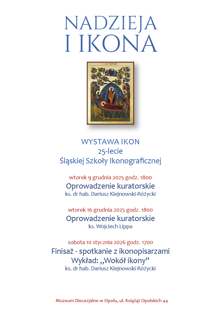 Z okazji 25-lecia Śląskiej Szkoły Ikonograficznej, której rektorem jest ks. dr hab. Dariusz Klejnowski-Różycki, prof. UO, odbędzie się w Muzeum Diecezjalnym w Opolu (ul. Książąt Opolskich 44) wystawa ikon pt. „Nadzieja i ikona”:
