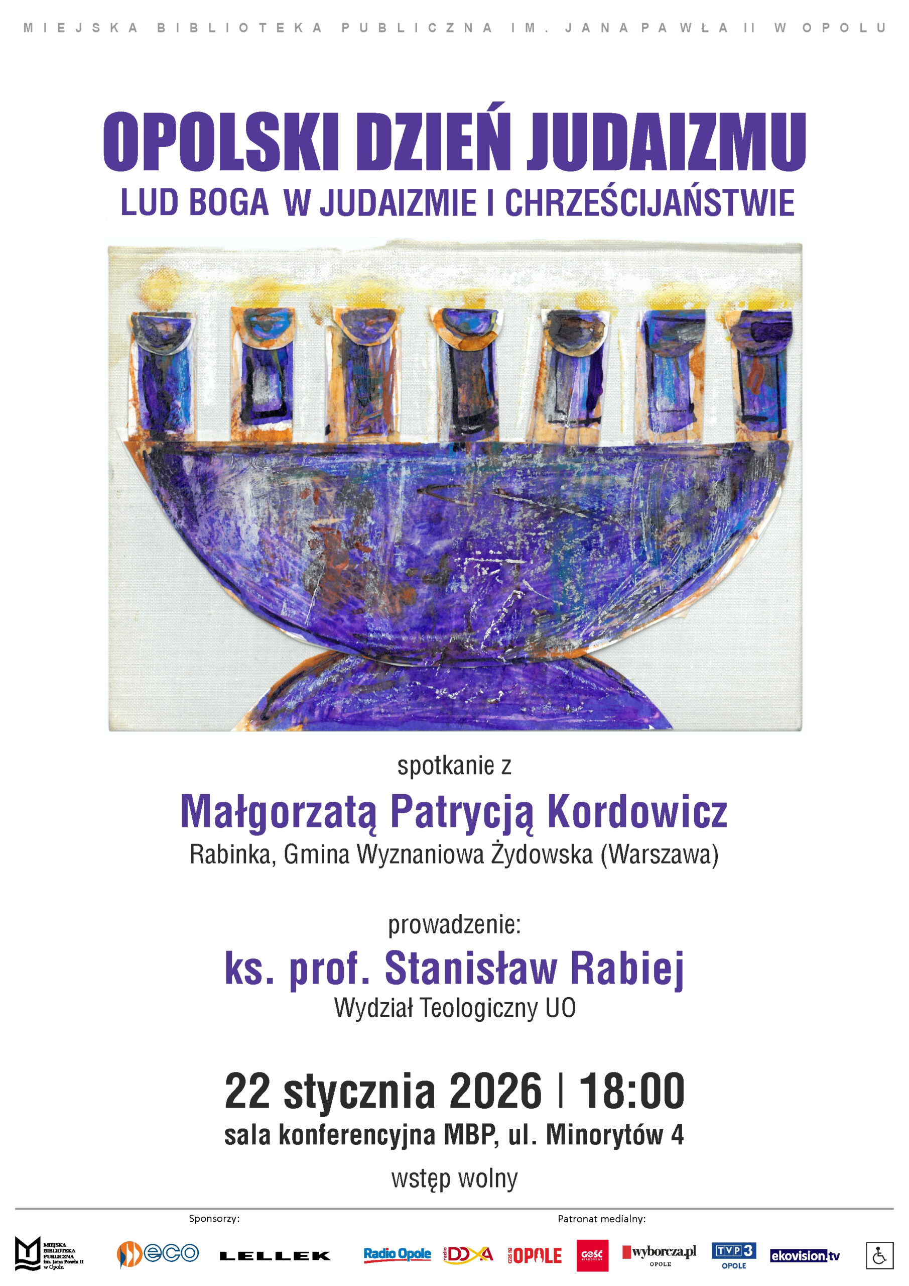 Serdecznie zapraszamy na Opolski Dzień Judaizmu poświęcony tematowi „Ludu Boga” w judaizmie i chrześcijaństwie, który odbędzie się 22 stycznia 2026 r. (czwartek) o godz. 18:00 w sali konferencyjnej Miejskiej Biblioteki Publicznej (Opole, ul. Minorytów 4).